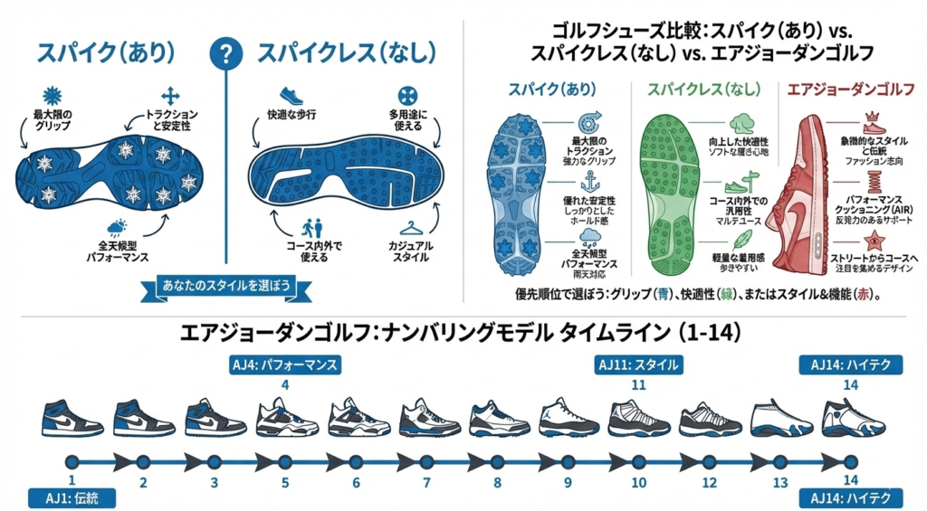 バスケットボール界の伝説、マイケル・ジョーダンのシグネチャーモデルは、今やゴルフコースでも圧倒的なステータスを誇ります。単なるデザインの流用ではなく、スイングに必要な安定性や芝の上でのグリップ力を備えた「本気のゴルフシューズ」として進化を続けています。