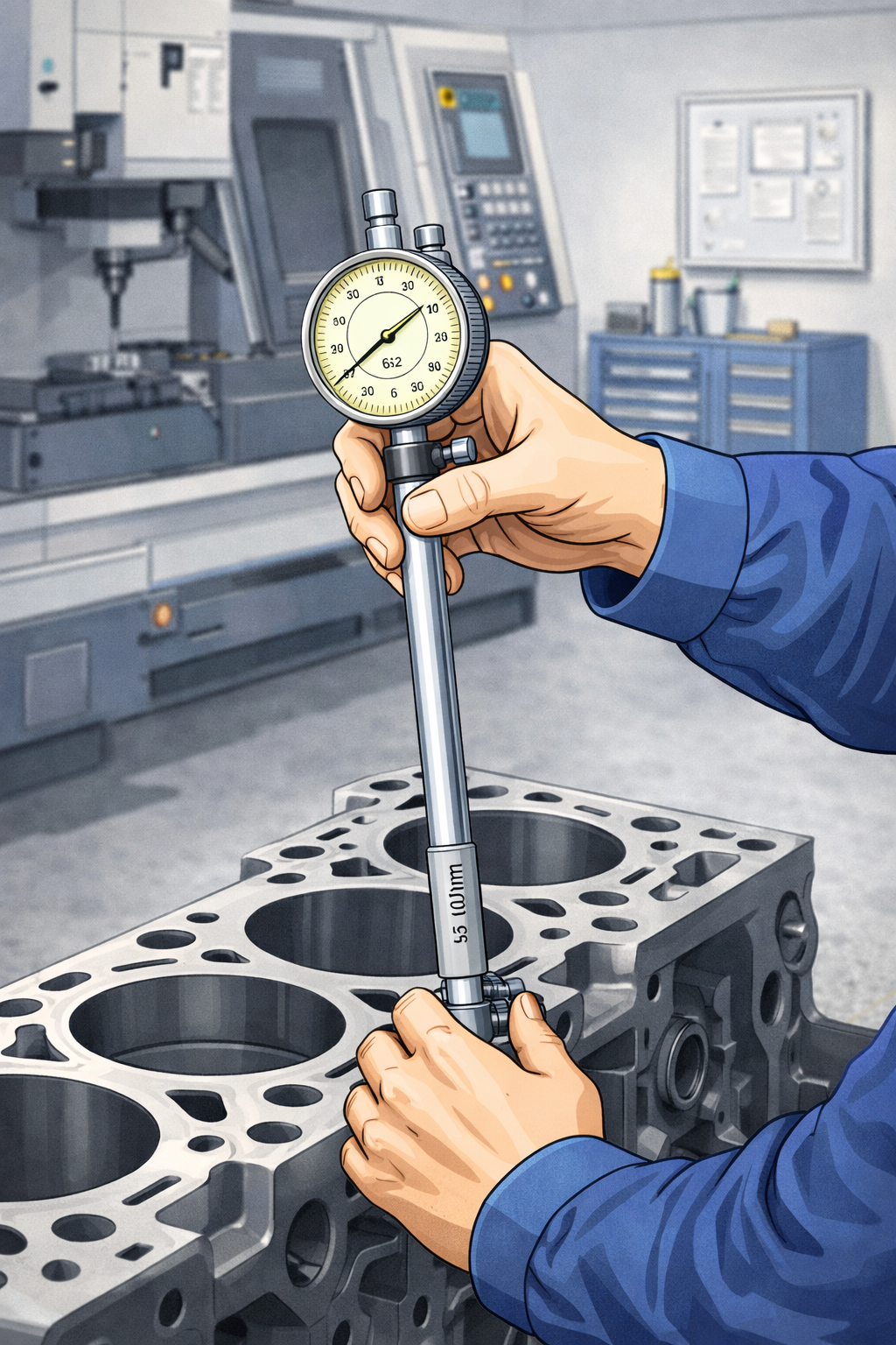 シリンダーゲージは、ボアゲージとも呼ばれ、エンジンのシリンダーやベアリングの受け穴など、穴の内径(内側の直径)を精密に測るための道具です。